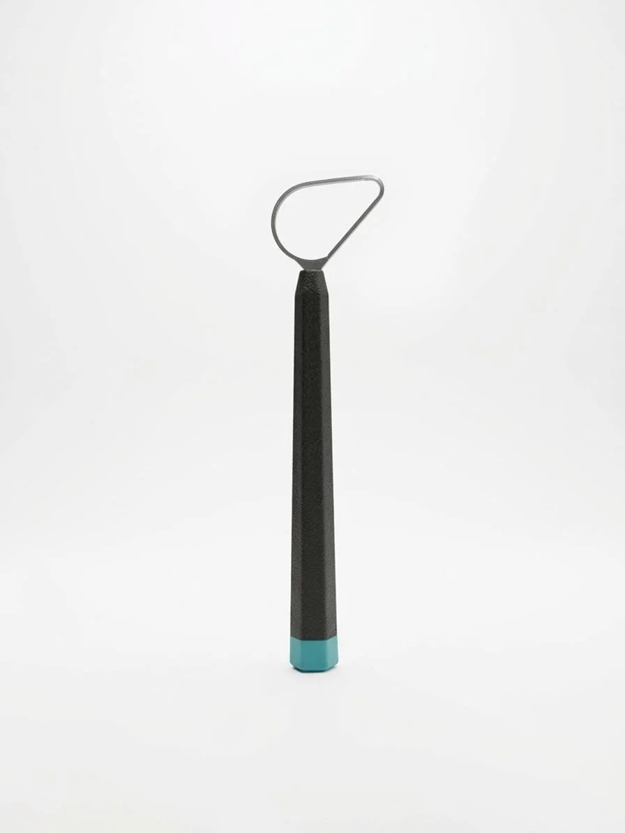 The handle is designed in Blender 3D and printed in carbon-fiber-reinforced PETG: rigid, dimensionally stable, resistant to the humidity and clay residue of a working studio. The hexagonal faceted profile ensures the tool never rolls. On a wet bench, on the edge of a wheel, on any surface, it stays exactly where you put it, tungsten carbide tip always clear of impact.